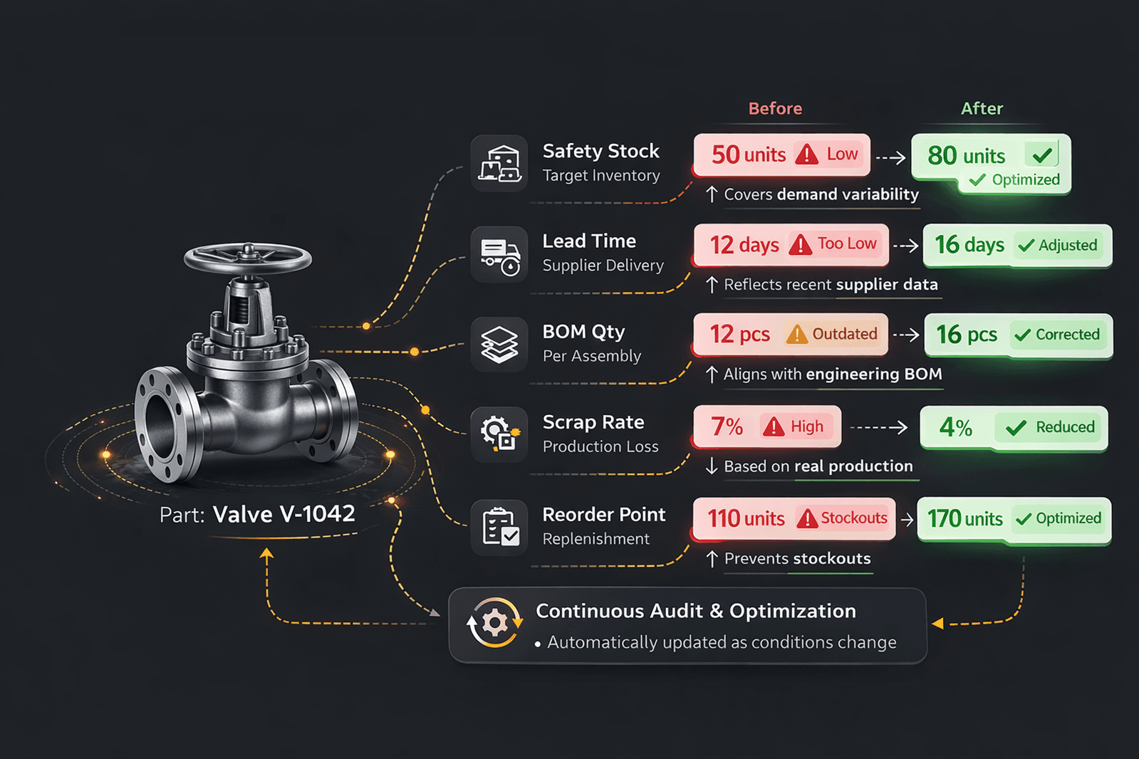 Instead of relying on static assumptions, the platform evaluates how materials actually flow through your supply chain and highlights where planning logic needs to be updated.